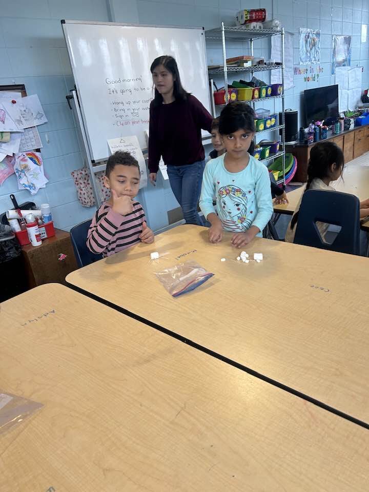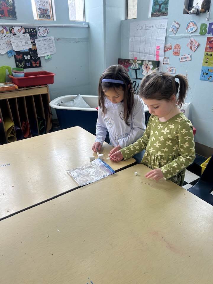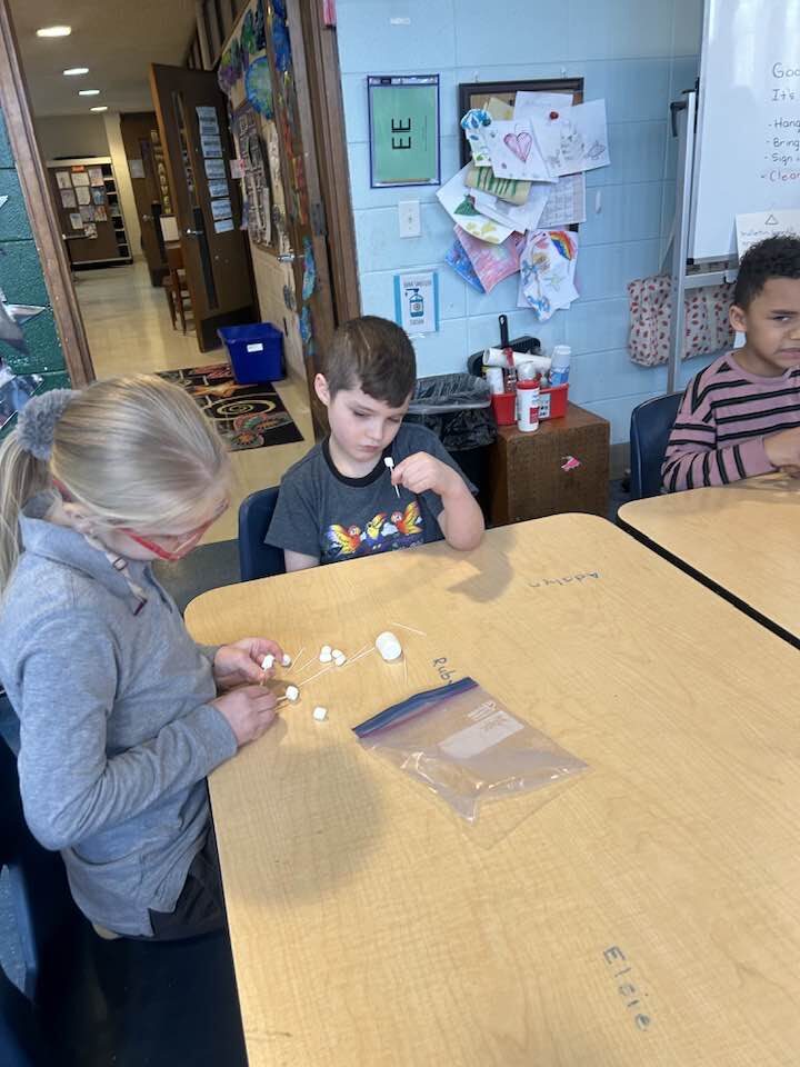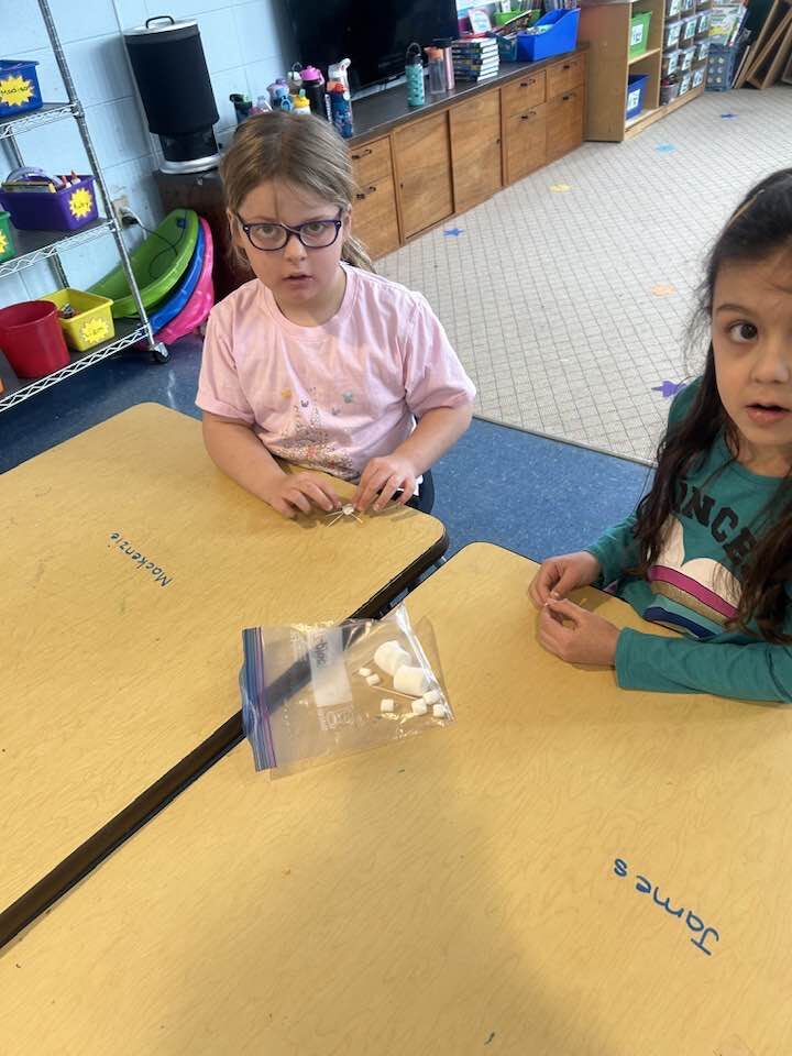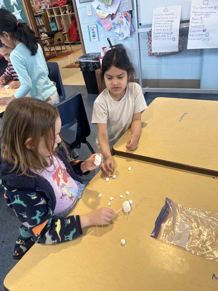 Can you create a snowflake that has 6 sides and is symmetrical? Our supplies were 2 large marshmallows, 10 small marshmallows, and 10 toothpicks. We then examined each and decided if they met the challenge.