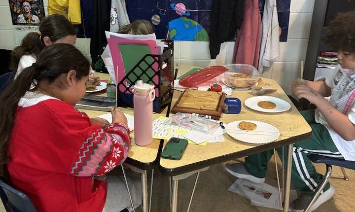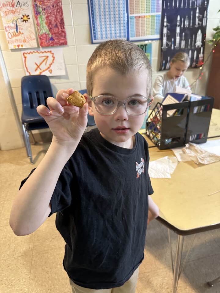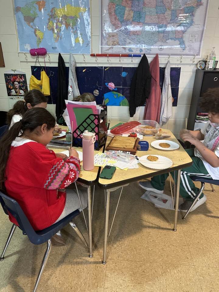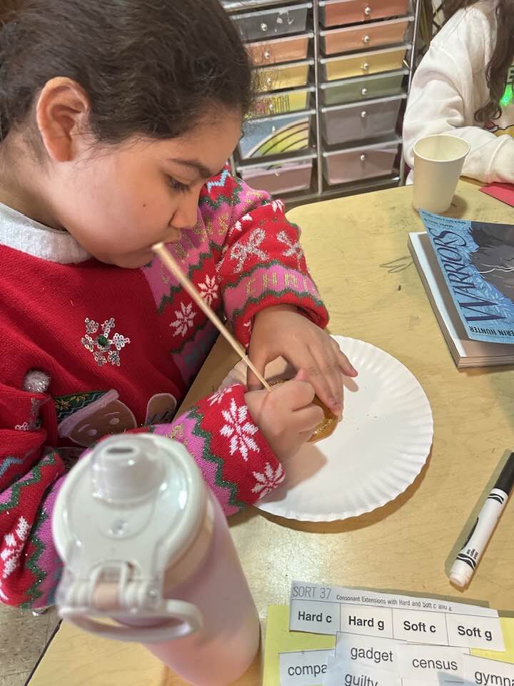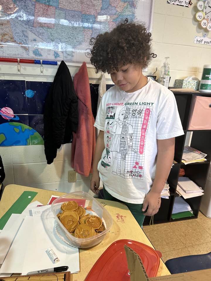 Next up for IE’s Holidays Around the World, Bennett chose Korea. He presented many facts about his country, but the best were the cookies from squid game. They are called Dalgomas. The students carved out the treat in the middle!
