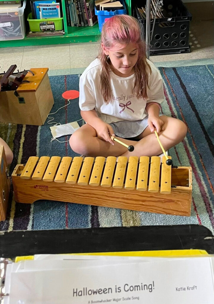 Intermediate playing Halloween is Coming on mallet instruments, which is a variation of the C scale. The students also enjoyed the Autumn Rhythm Rap!
