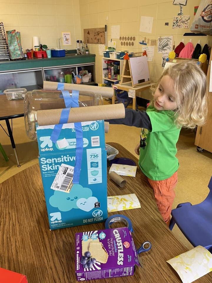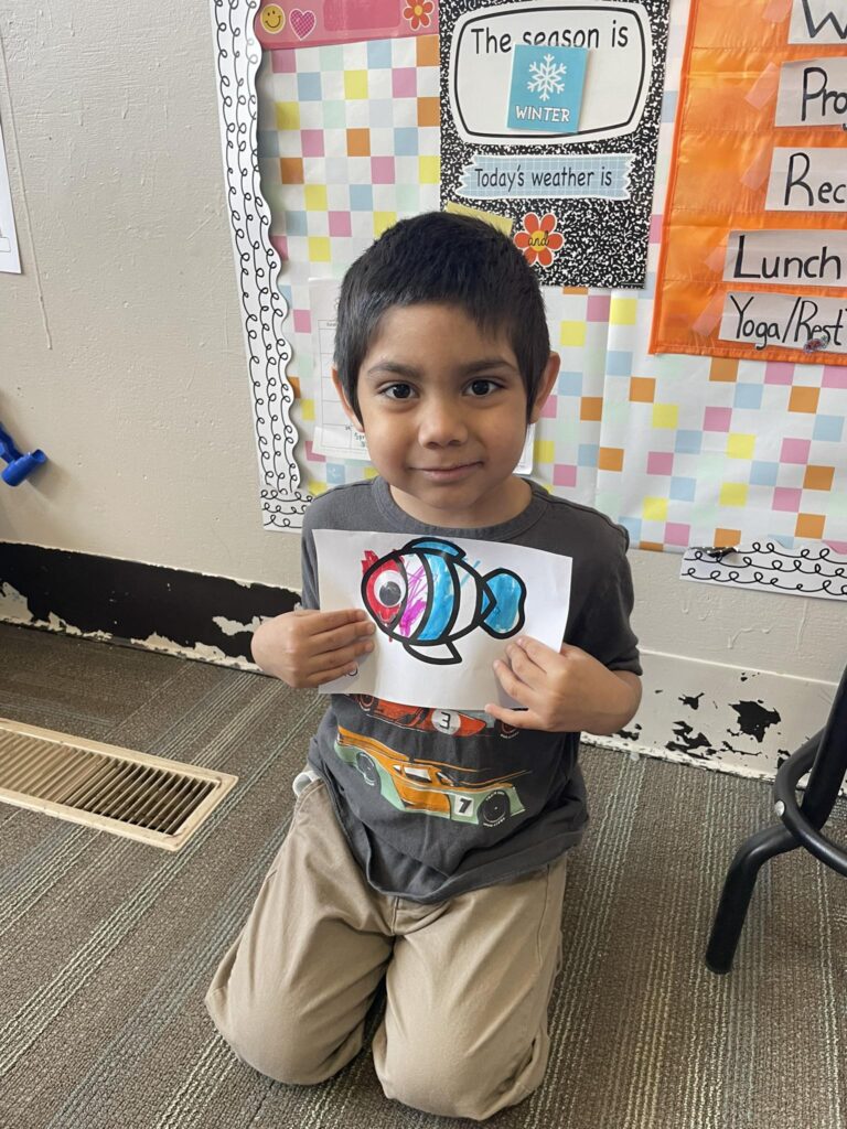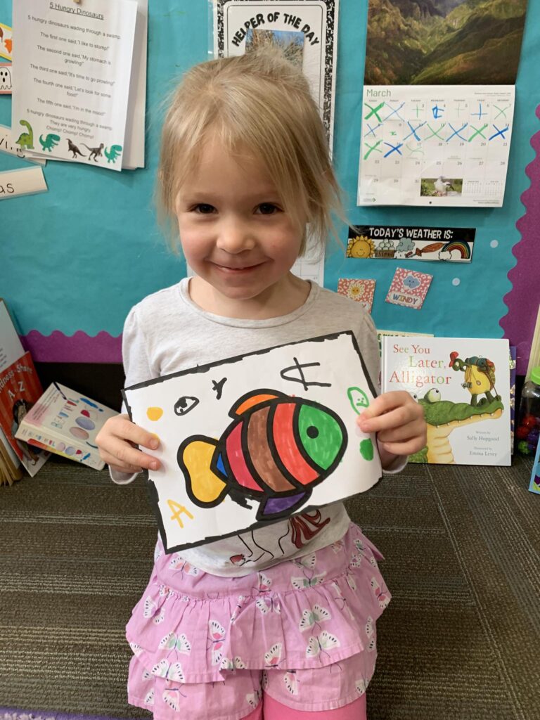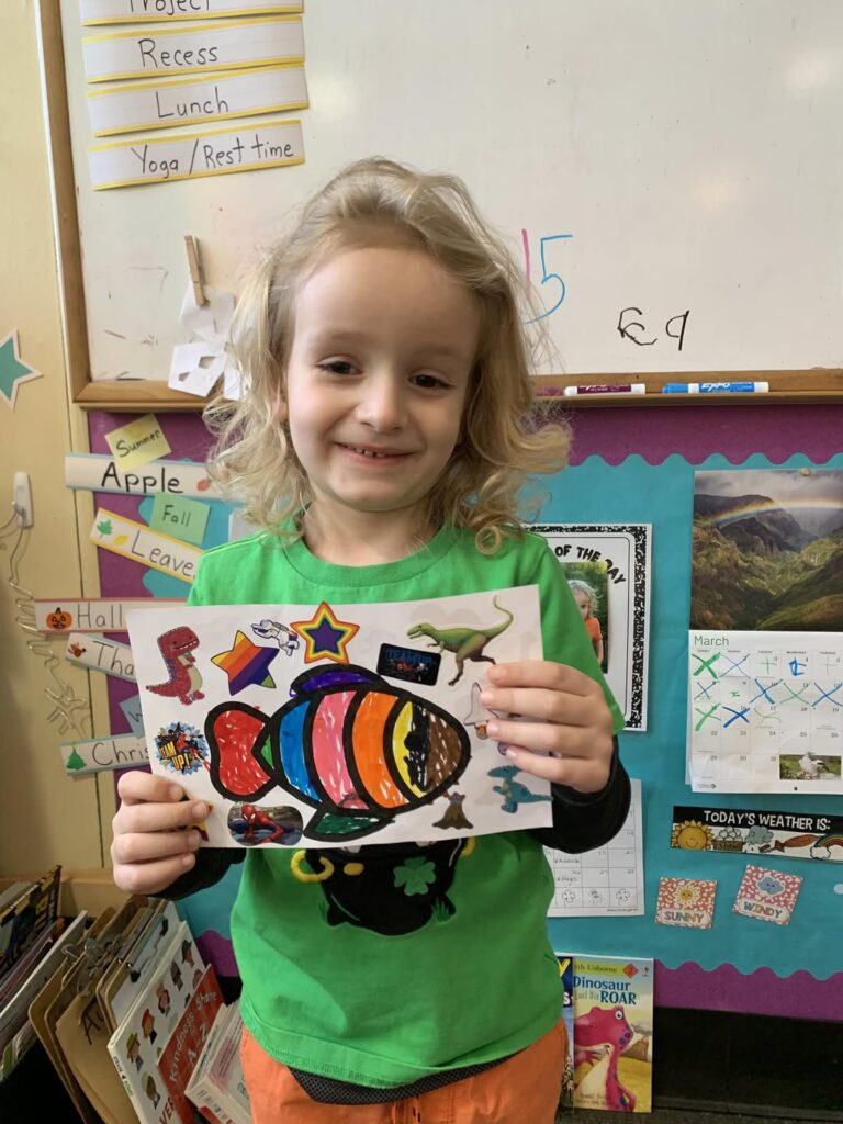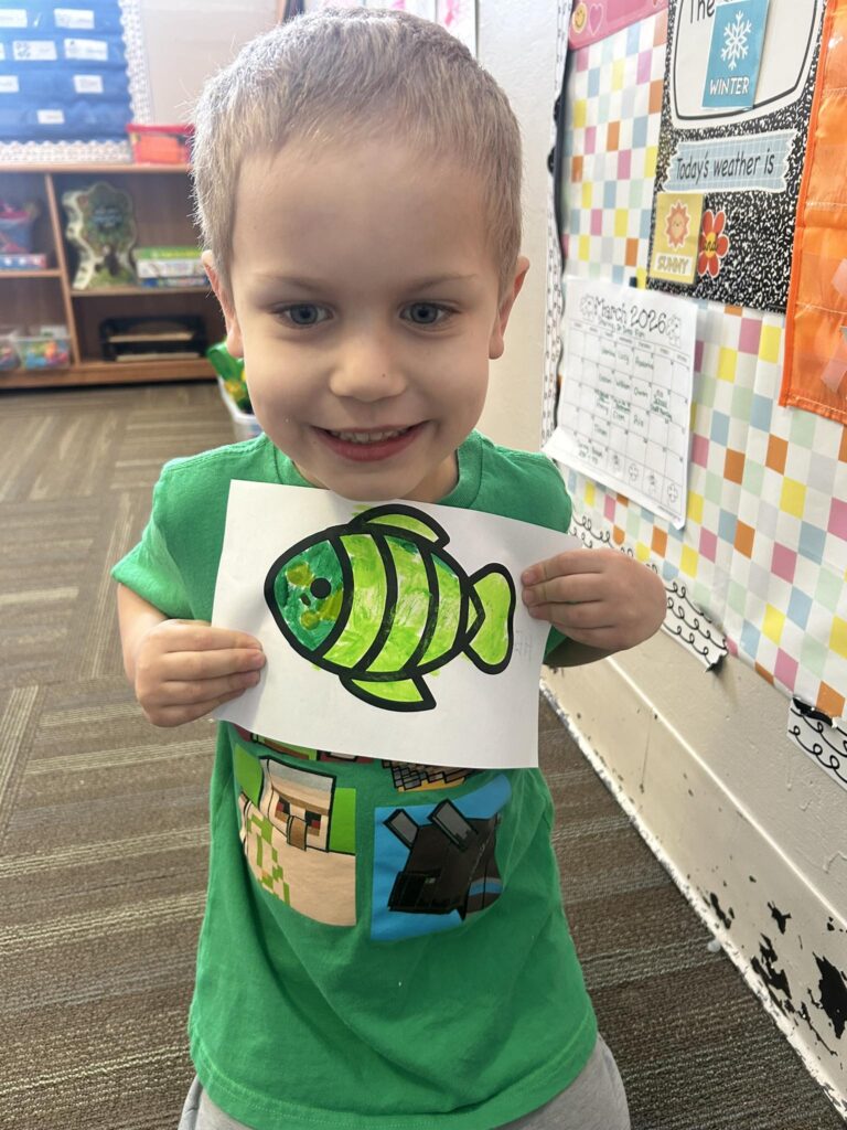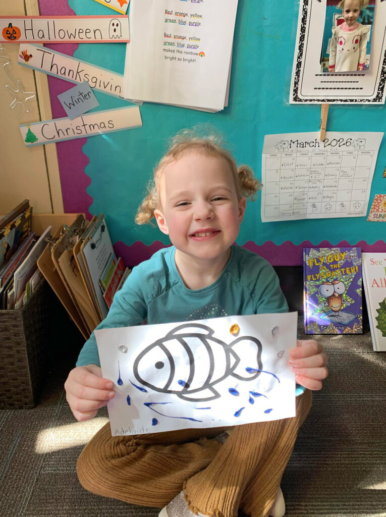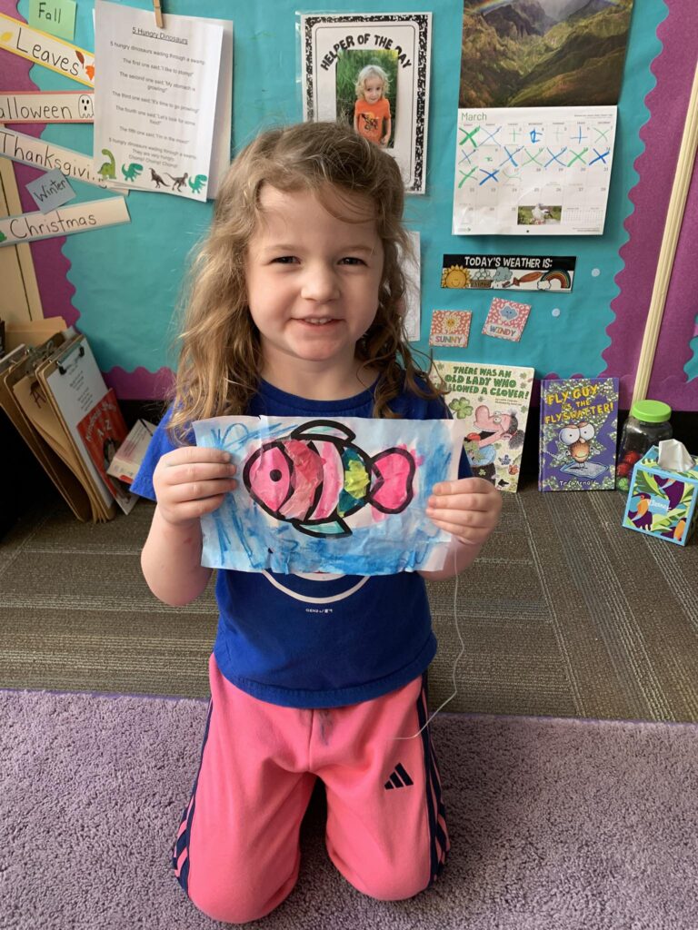 This week in Preschool, Henry brought in his green Dr. Seuss fish named Fish the Magician, Jackson shared his fish that he filled in with markers and stickers, Norah shared her creative fish kite, Avery shared her colorful smiley face fish, Clementine shared her fish covered in wiggly eyes, Adelaide shared her fish that had bubbles made of sparkly glue, and Rio shared his Super Mario-colored fish!