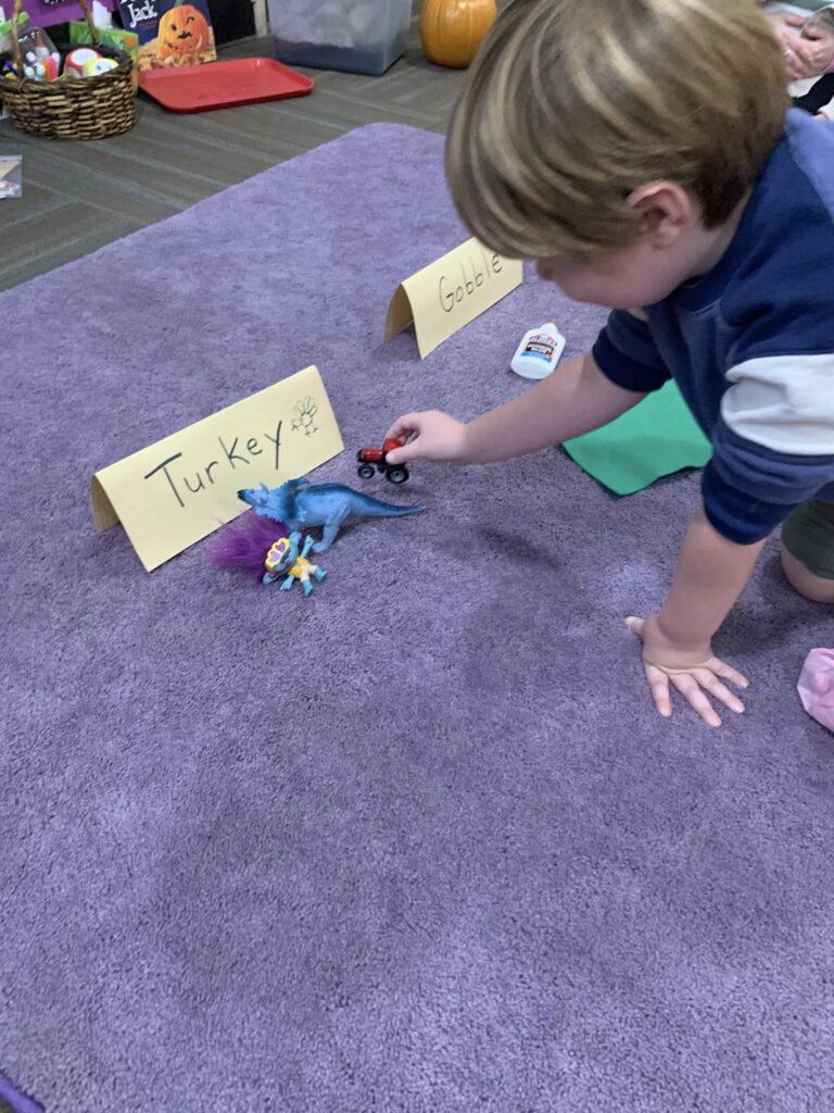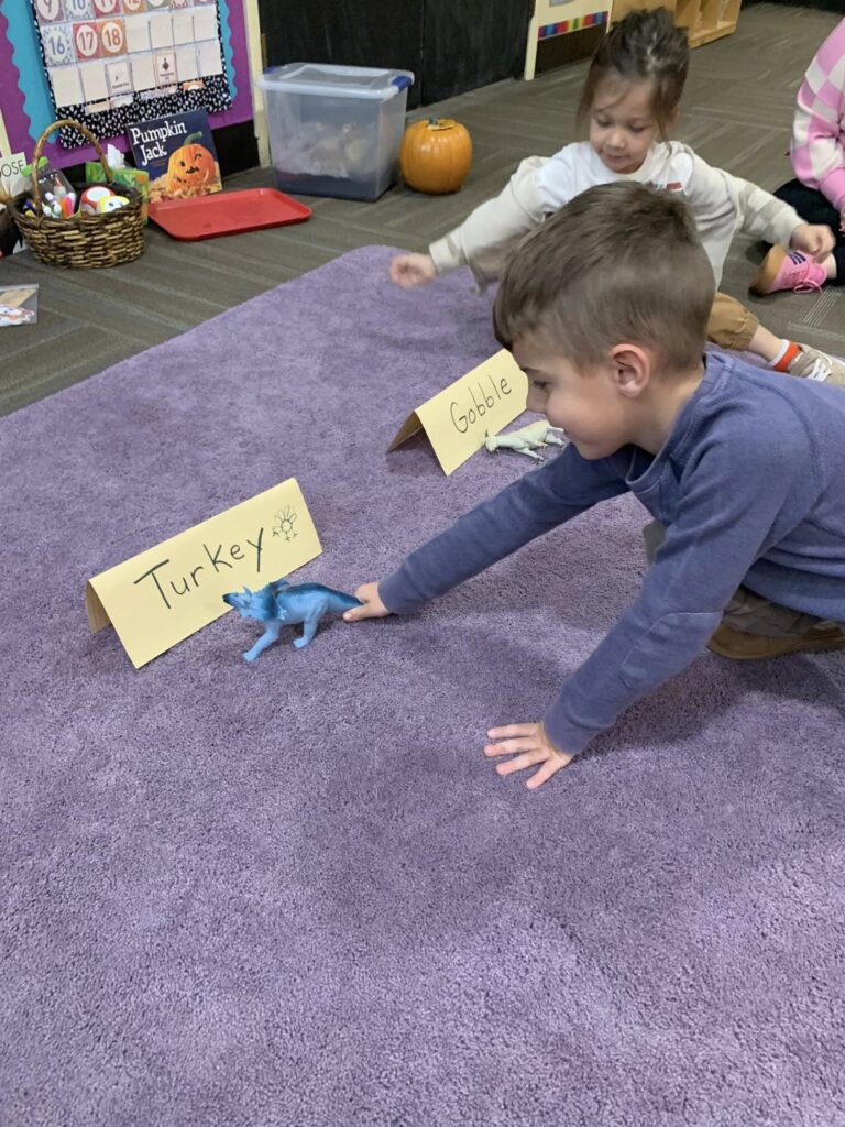Exploring beginning sounds in Preschool. T for turkey or G for gobble?