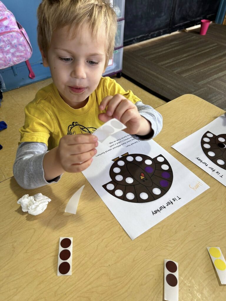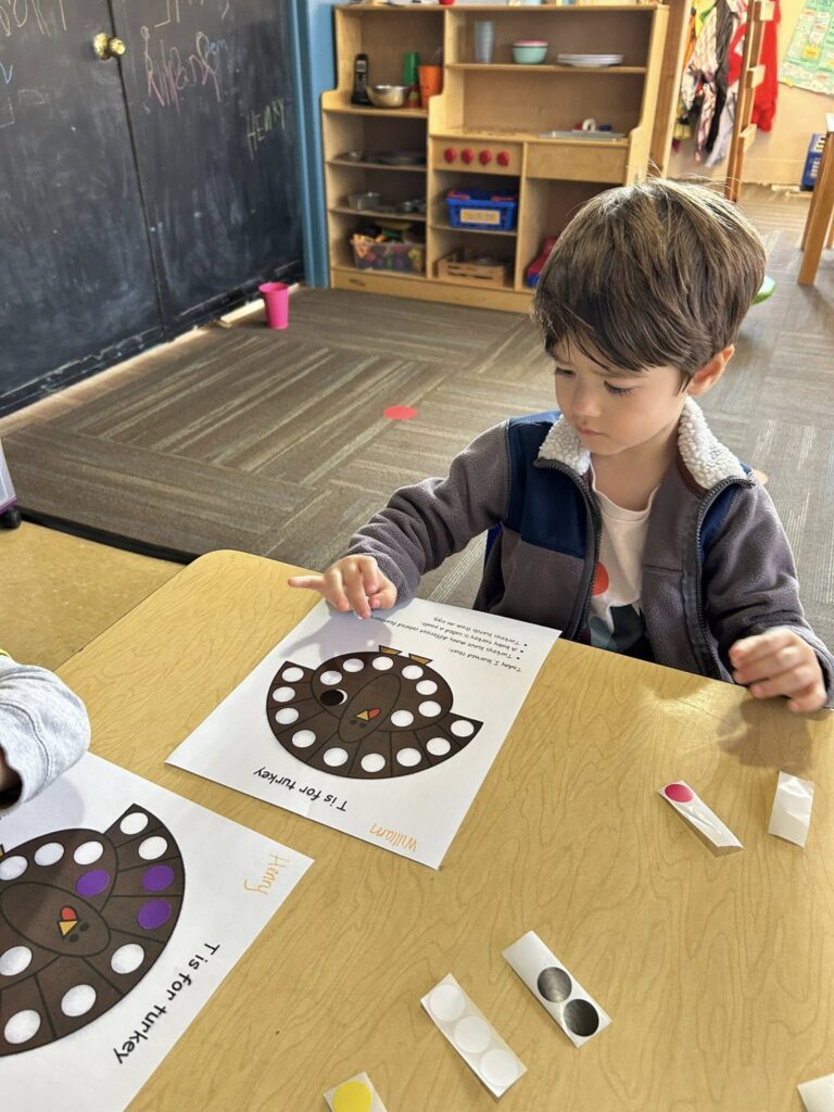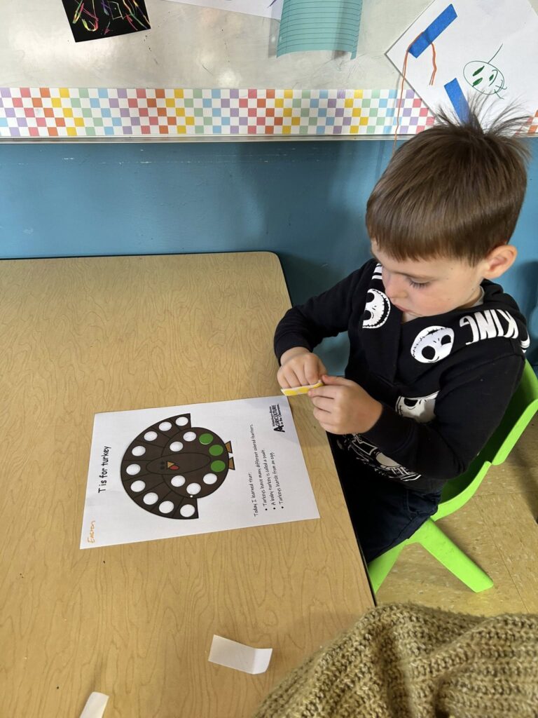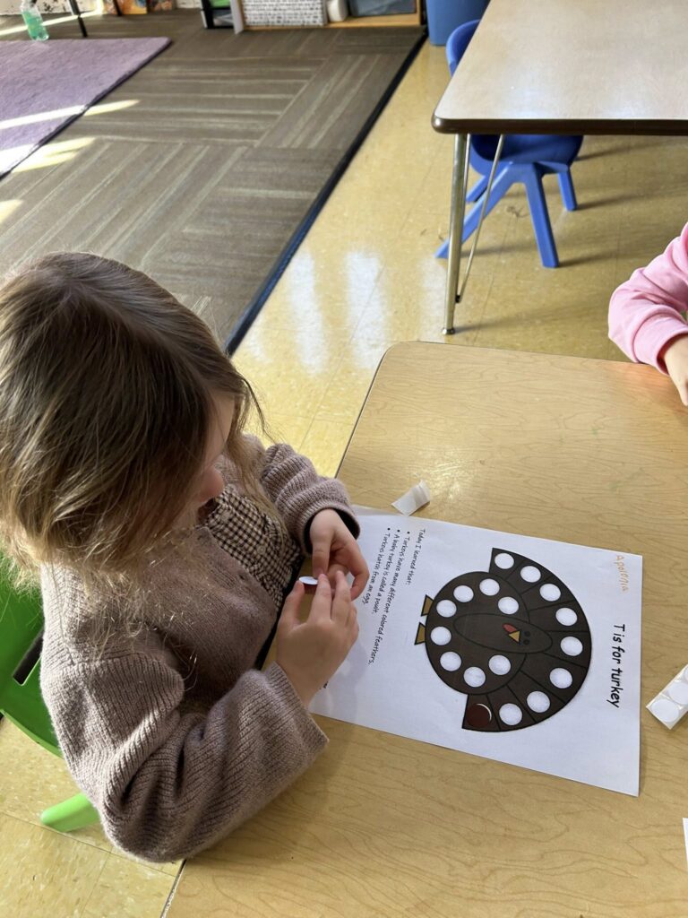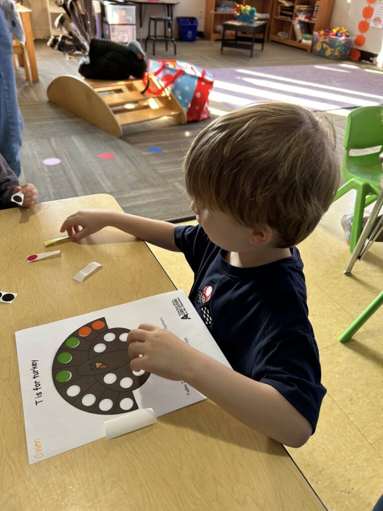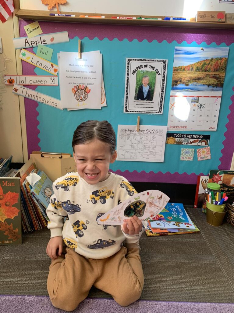 This week in Preschool, Owen shared his colorful feather that he decorated, Elliot shared a laughing turkey feather, and Havi shared a turkey feather created with stickers!