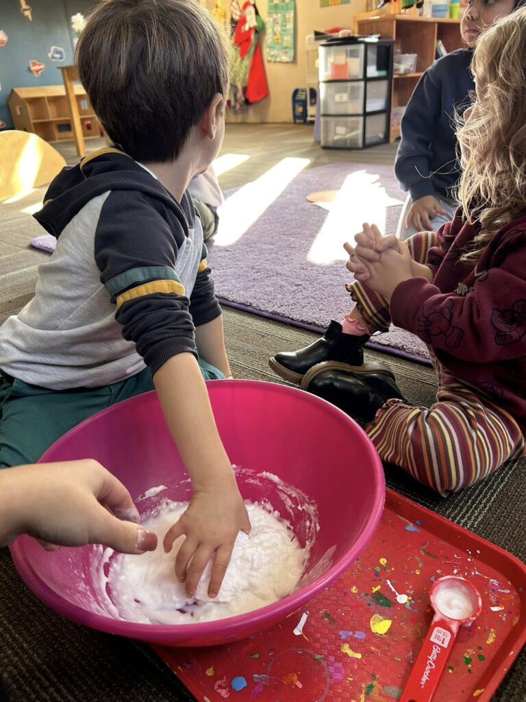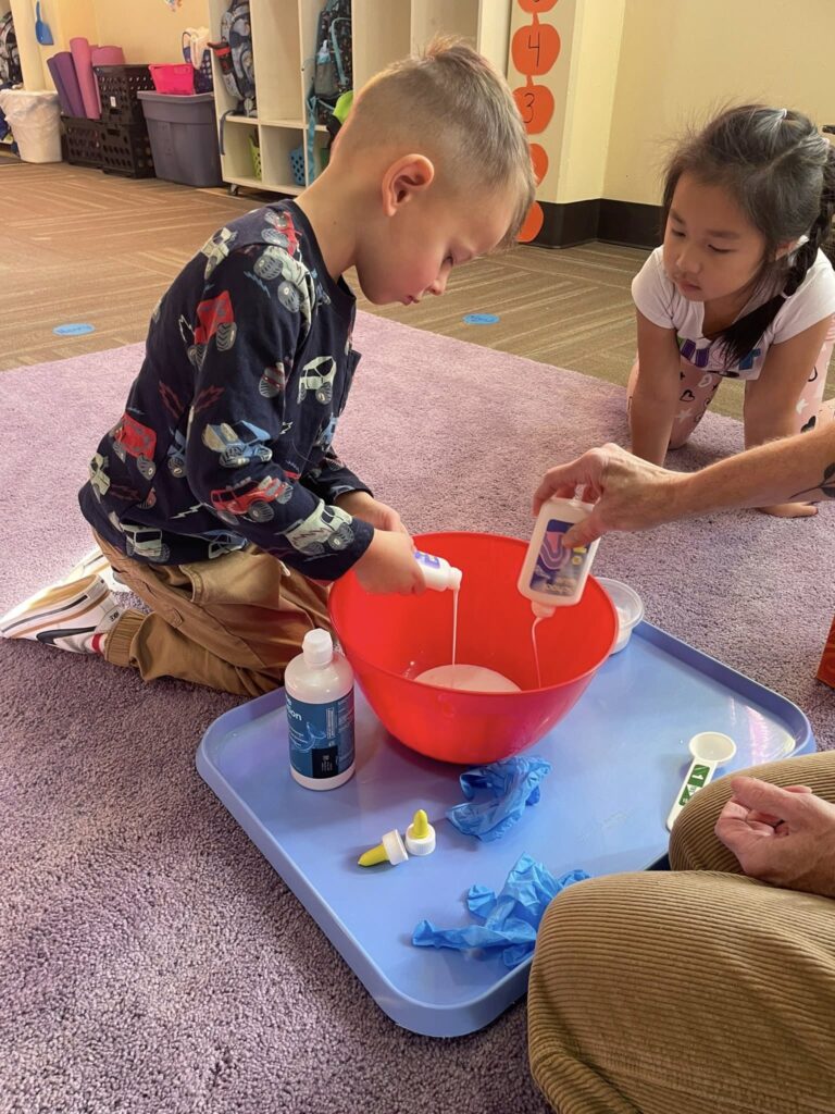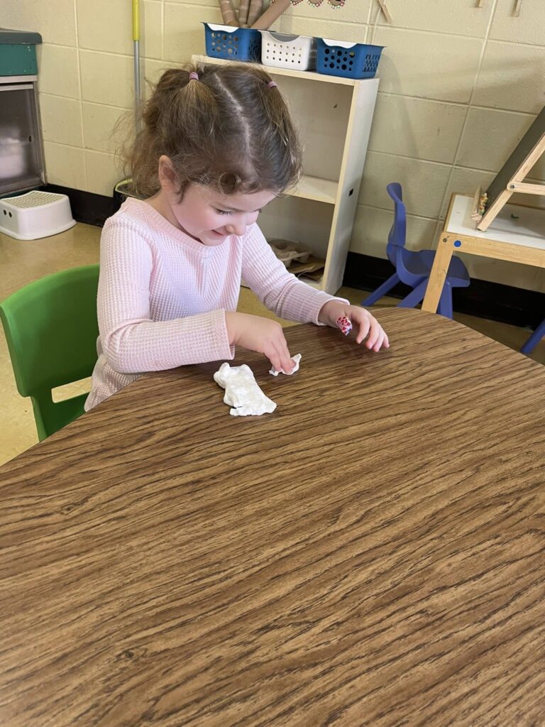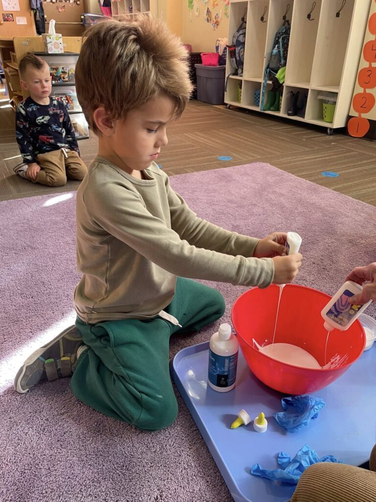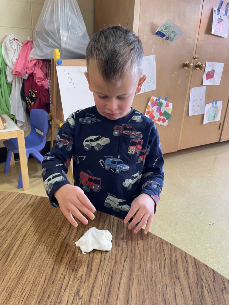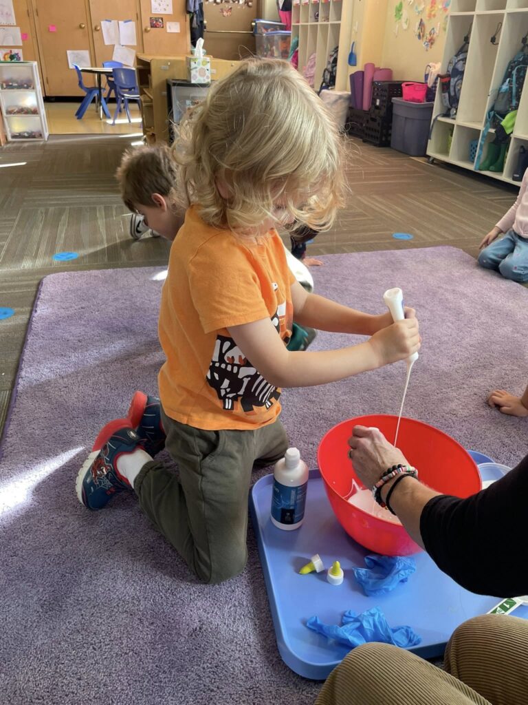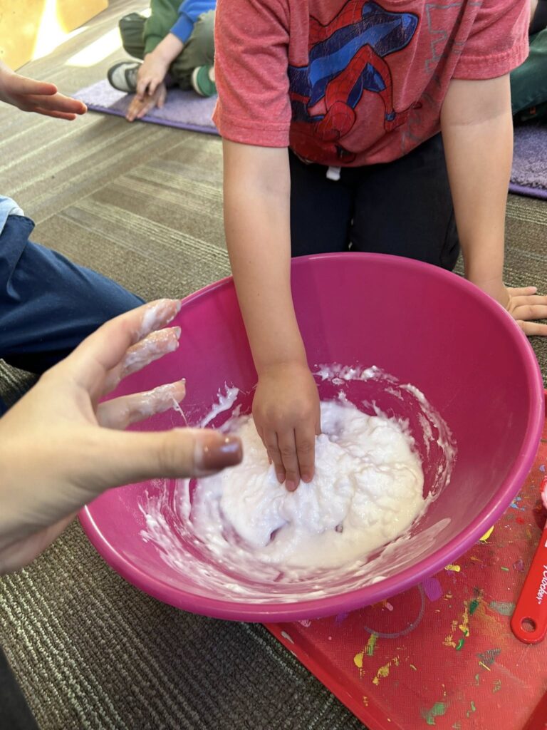 This week, Preschool did a science experiment! We talked about mixing 2 liquids and a solid together to make a chemical reaction, which was slime! Ask your preschooler what they noticed about it and how it felt!