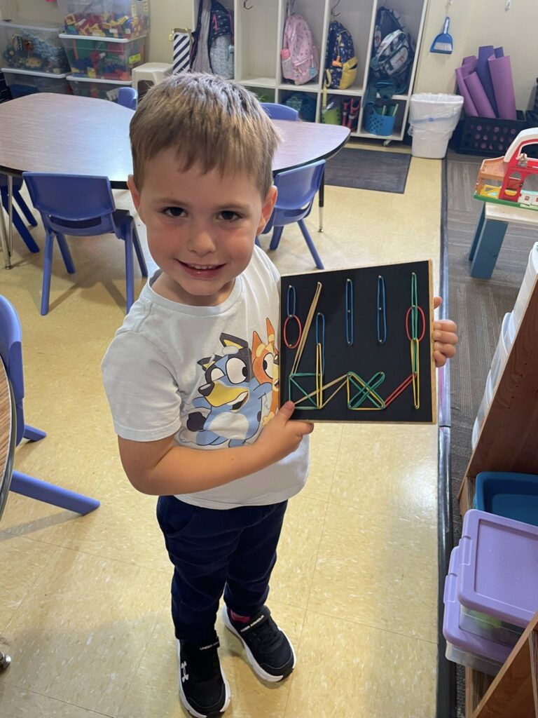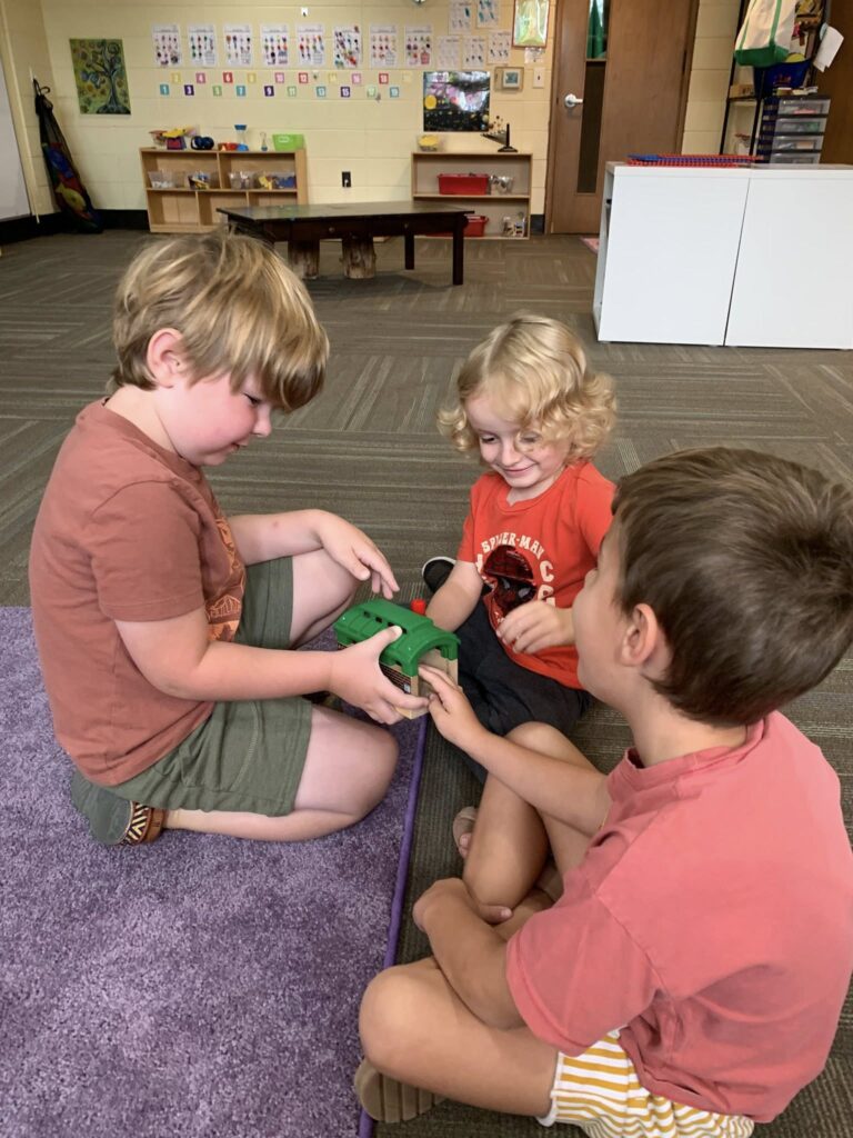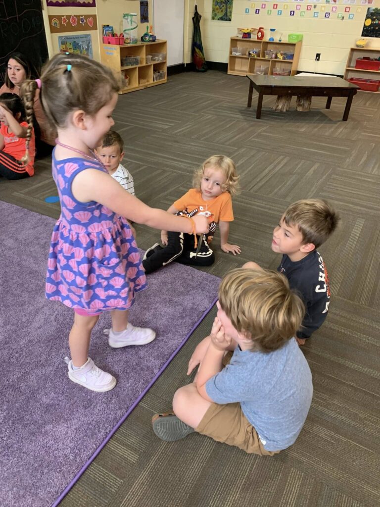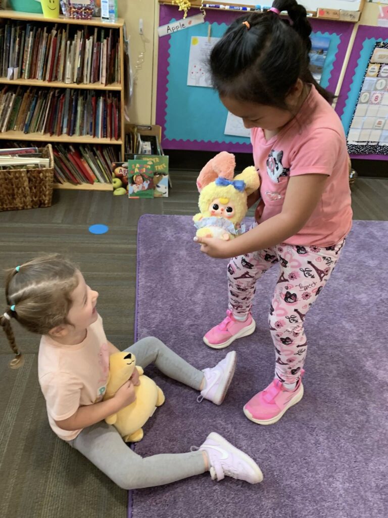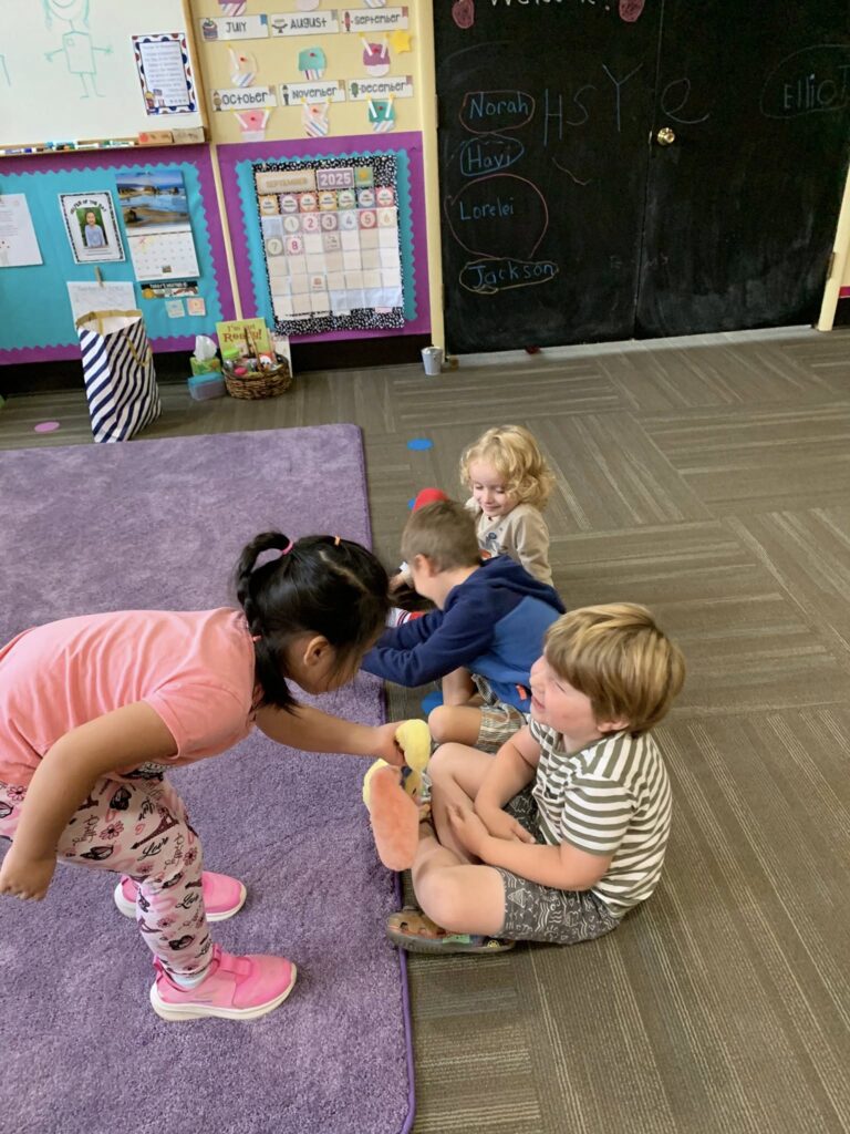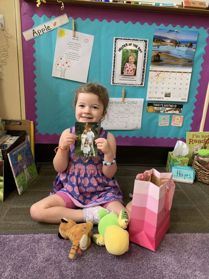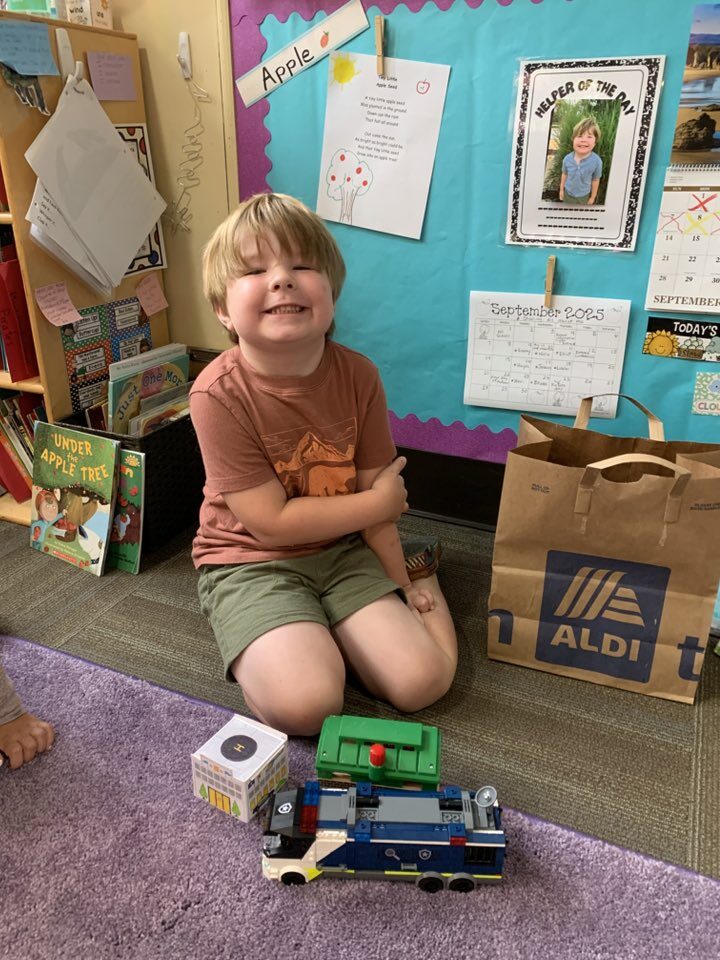 This week in Miss Shelley’s Preschool class: Emmy shared her book about bees, a stuffy, and a special pillow, Nora shared her birdy, Toby, and a family picture, and Elliot shared his police truck, police cube, and train tunnel!