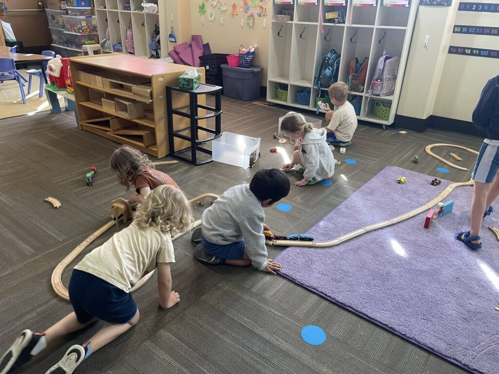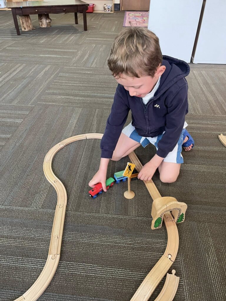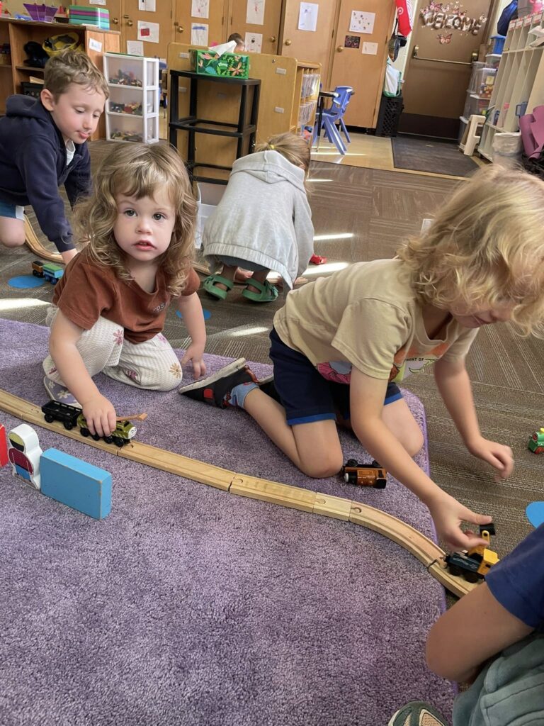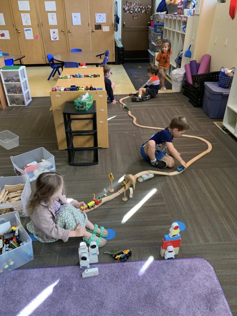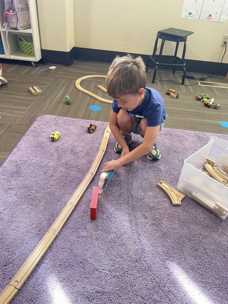 Havi made a parking garage and is parking the fire trucks! Pola, Ephi, Easton, and William worked on building a train track and hope to get it all the way to the door!
