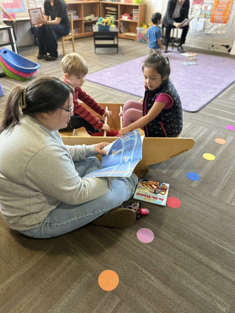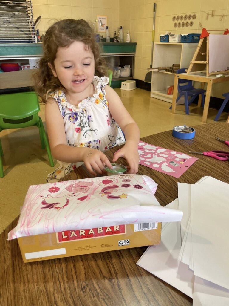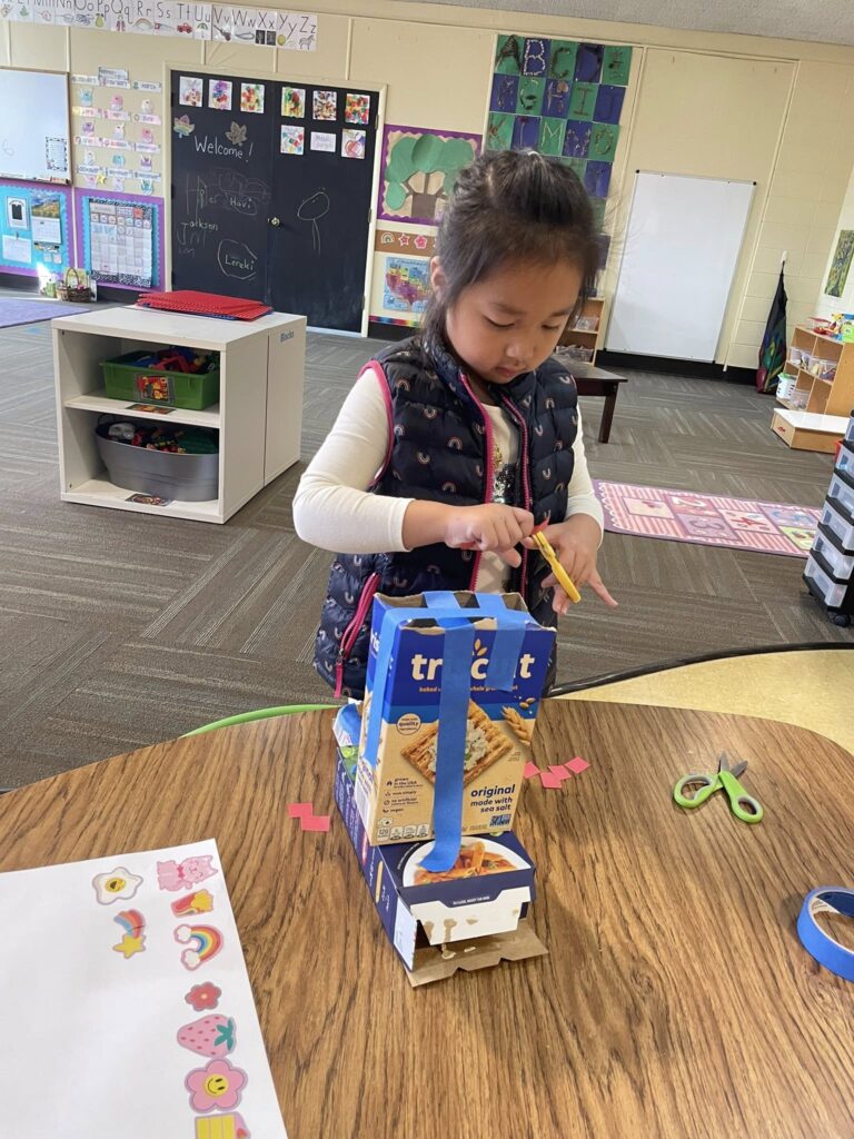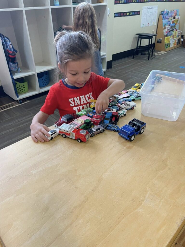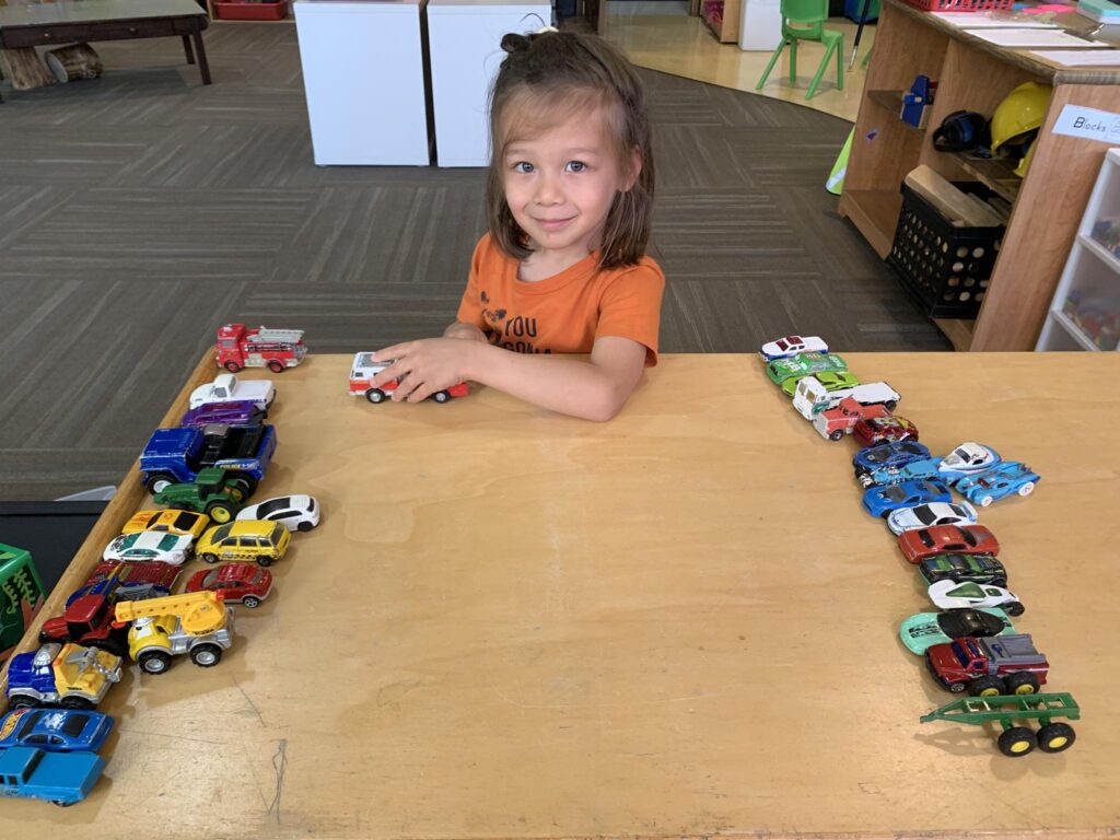 Havi made a parking garage and is parking the fire trucks! Pola, Ephi, Easton, and William worked on building a train track and hope to get it all the way to the door!