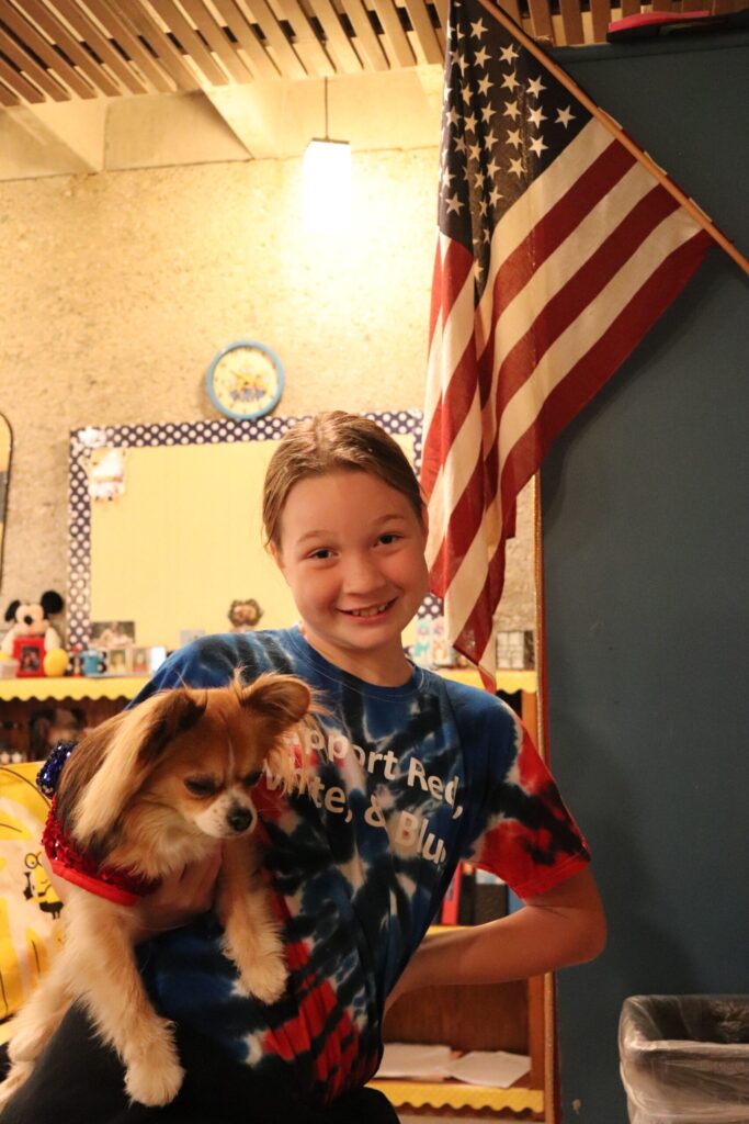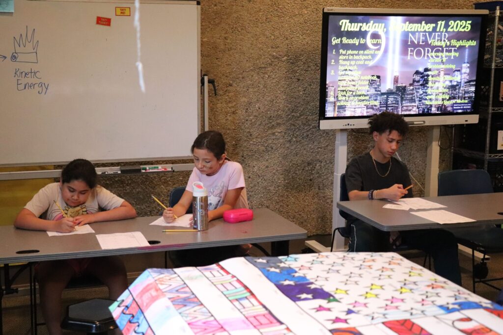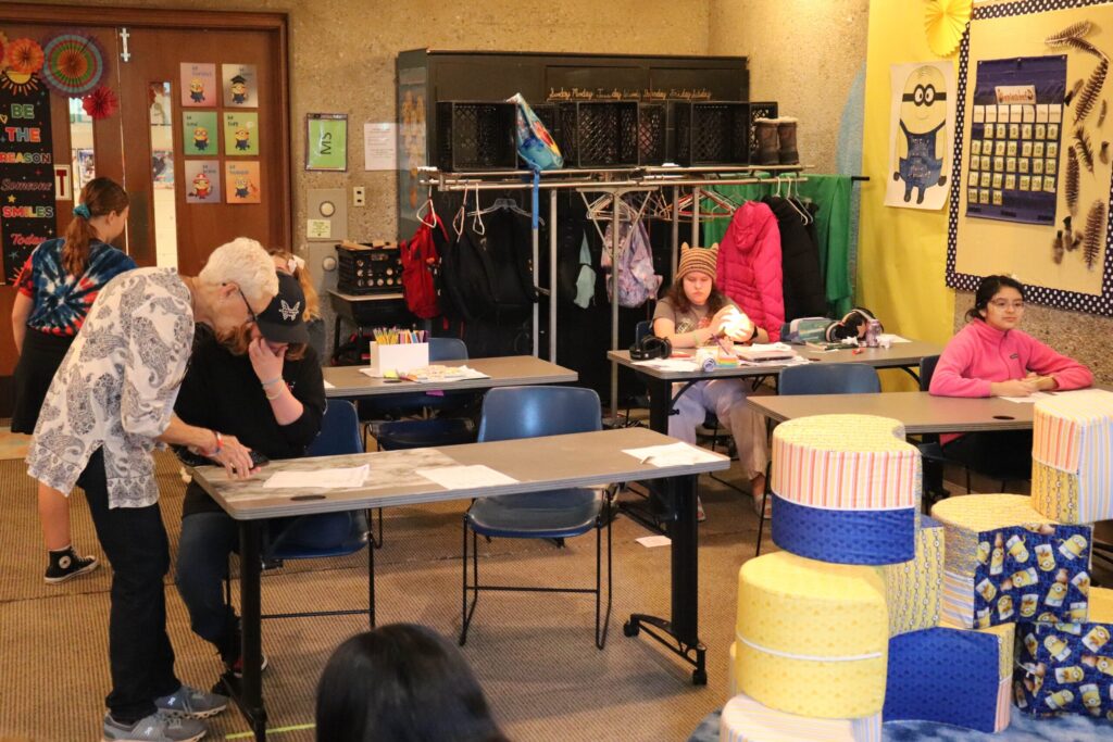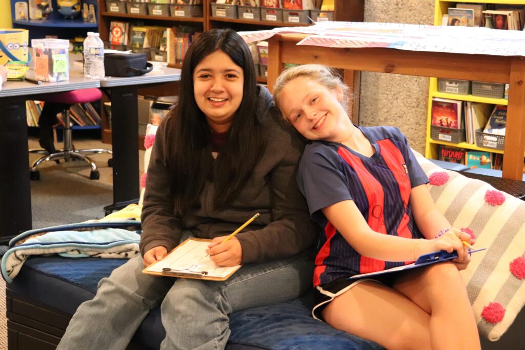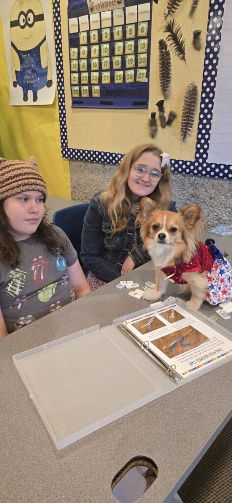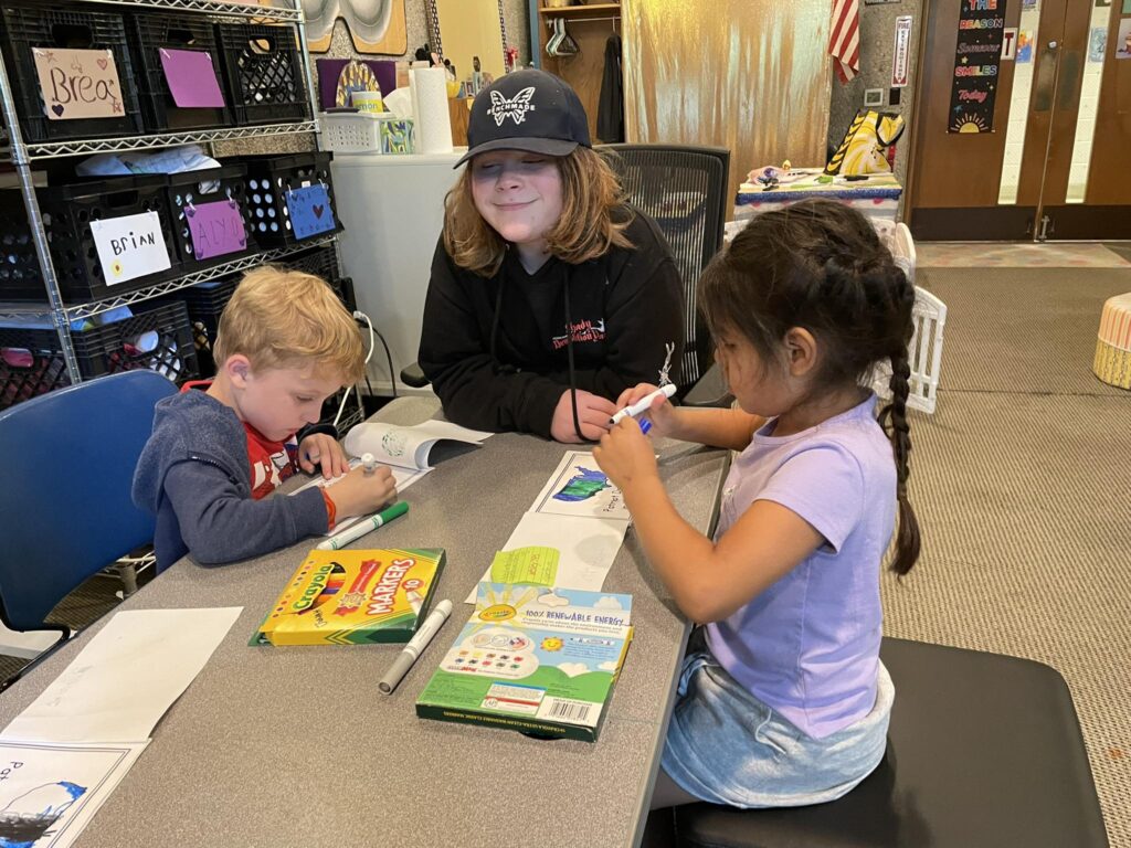 Sweet interaction between Early and Upper students, coming together to work on Patriot’s Day books!